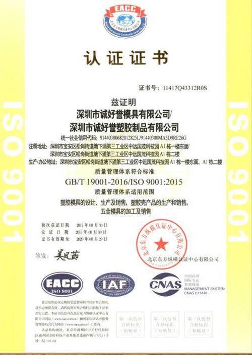 祝賀:誠好譽(yù)模具順利獲得GB/T 19001-2016/ISO 9001:2015認(rèn)證證書,認(rèn)證即信任,誠好譽(yù)將繼續(xù)努力,不負(fù)眾望,不斷創(chuàng)新產(chǎn)品,提高產(chǎn)品質(zhì)量的同時(shí),也把服務(wù)做好,把模具產(chǎn)品做得越來越好的!